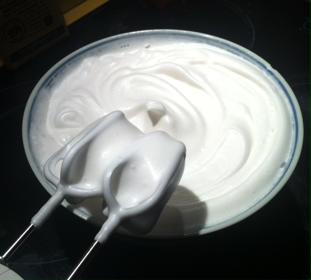 Récupérer le jus de pois chiche. Dans un saladier fouetter le jus au batteur comme pour les blancs en neige. Le jus va monter doucement comme des blancs d’oeufs.